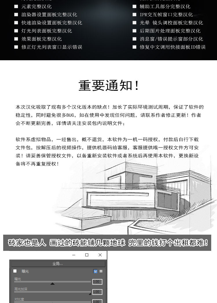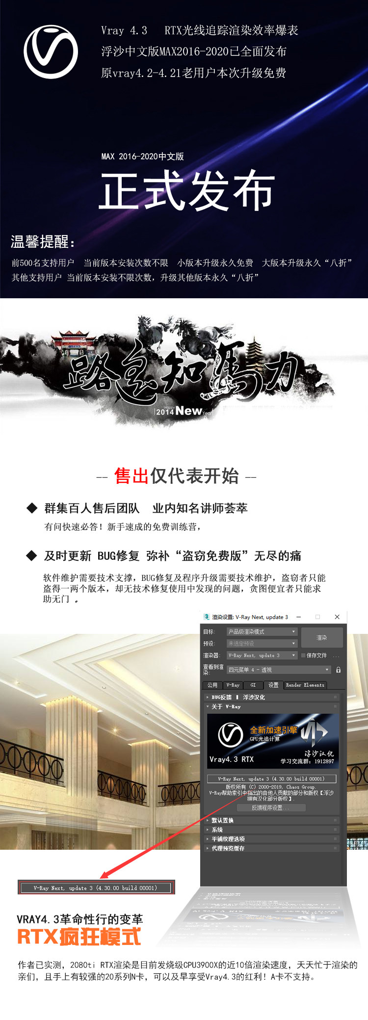 vray4.3更新公告 ◆ V-Ray GPU RTX Support - Accelerate your workflow with RTX support on V-Ray GPU. ◆ Vray GPU RTX支持-加速您的工作流程与RTX支持Vray GPU. ◆ Debug Shading - Easily isolate textures, materials and geometry to help debug large shading networks in V-Ray IPR and V-Ray GPU IPR. ◆ 调试阴影-更容易隔离纹理、材质和几何形状,以帮助您调试Vray IPR和Vray GPU IPR中的大型阴影网格。 ◆ V-Ray Toon Shader - Quickly add cartoon and cel-shading effects to your 3D projects. ◆ vray toon着色器-快速添加动画和粒子遮光效果到您的3d项目中 ◆ V-Ray GPU Support for alSurface material - A general-purpose shader with layered SSS and glossy fresnel reflections on V-Ray GPU. ◆ VRAY GPU支持AL曲面材质.在Vray GPU上具有分层sss和光滑菲涅耳反射的通用着色器 ◆ Memory Tracking - Optimize your scene with the new memory usage report for textures and objects. ◆ 内存跟踪-使用新的纹理和对象内存使用报告优化场景 ◆ Color corrections in Viewport IPR - Apply V-Ray Frame Buffer color corrections directly in the Viewport IPR. ◆ 视口IPR中的颜色校正-直接在视口IPR中应用Vray帧缓冲区颜色校正。 ◆ V-Ray GPU Support for VRayDistanceTex - Faster setup of your scene's shaders and render effects based on geometry with V-Ray GPU. ◆ Vray GPU支持VRAY距离纹理-更快地设置你场景中的着色器和渲染效果基于几何体与Vray GPU。 ◆ Dust and Scratches Lens Effect - Simulate real-world camera lens effects with new procedurally generated Dust and Scratches. ◆ 蒙尘和划痕镜头效果-模拟真实世界的镜头效果与新的程序产生的蒙尘和划痕。 重要提示: 一:Vray4.3 GPU渲染加成仅支持N卡RTX 20系列光线追踪显卡和部分N系列具有RTX功能的专业卡系列.全系N卡均可支持老式GPU的cuda渲染。A系列显卡均不支持GPU渲染。 二:AI智能降噪功能大幅提升,细节相比之前版本有了较大优化。 正式发布一个多月以来,浮沙汉化无论完整还是稳定性及BUG的数量,均得到了所有正式使用用户的肯定与赞赏,为了感谢广大老客户,本次较大版本的升级,作者对所有老用户均开发免费升级。